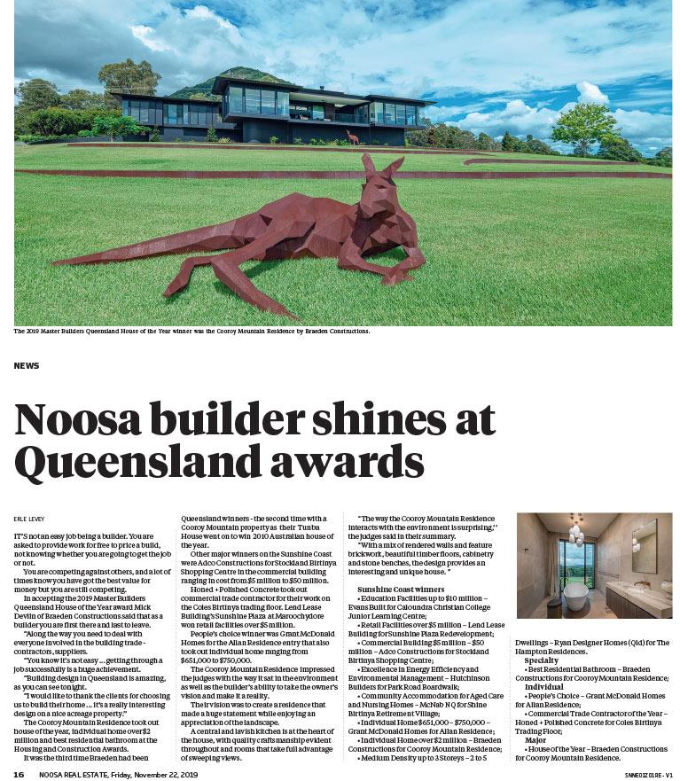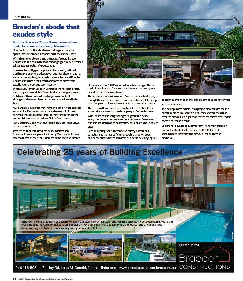 Braeden Constructions is a local Noosa Building Company who has just recently won the very prestigious Master Builders Association QLD house of the Year for 2019. The home is located in Cooroy Mountain and was crafted by many Sunshine coast local tradesmen and suppliers.